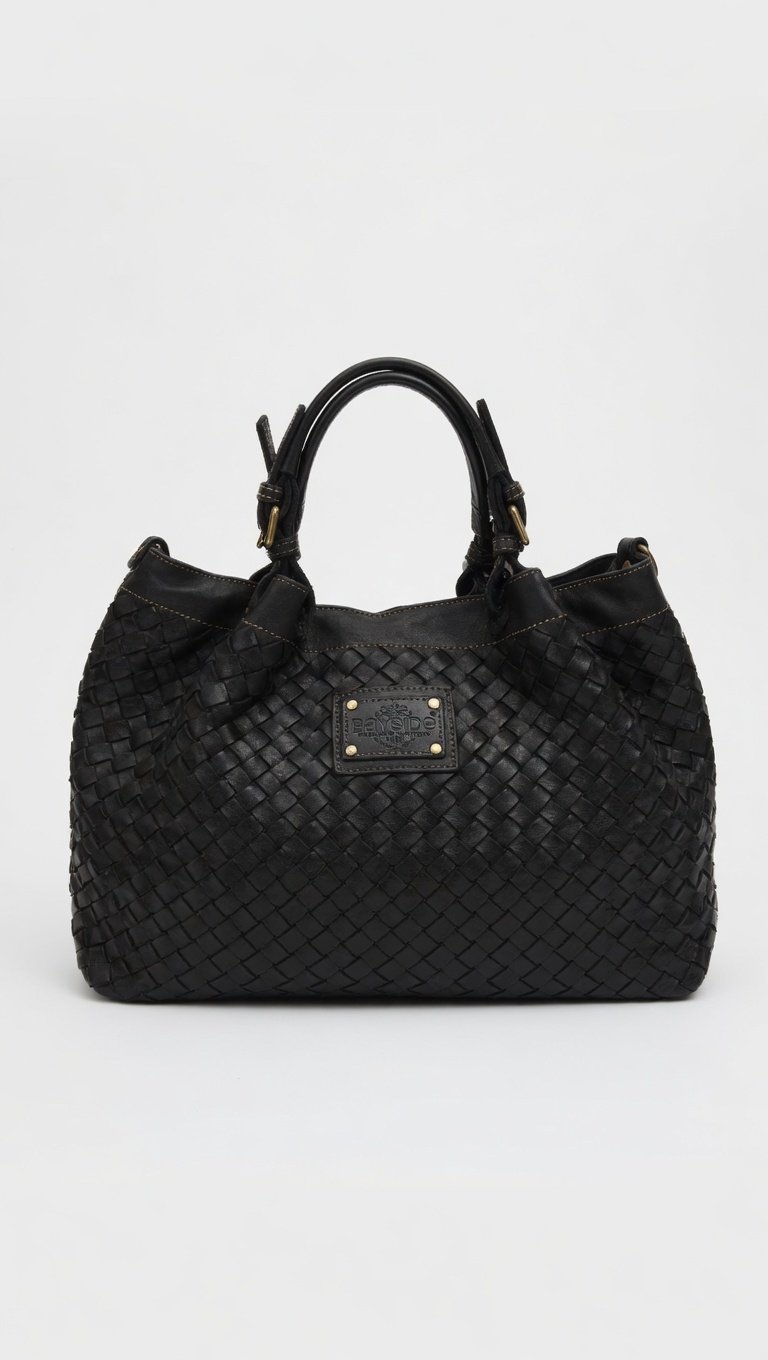 Hobo bag in pelle nera con lavorazione intrecciata (woven). Manico lungo unico, forma morbida e capiente, chiusura con zip o bottone magnetico. Look casual-chic e molto versatile.