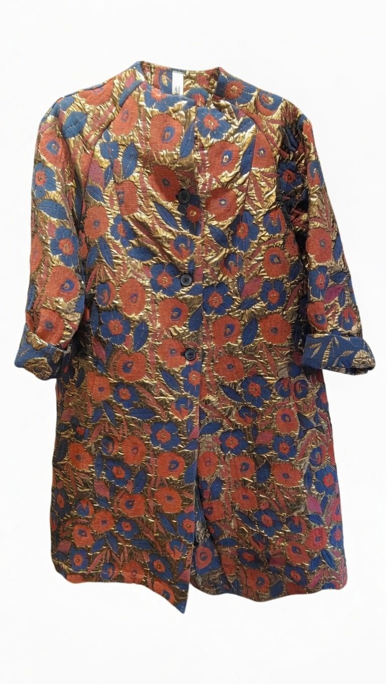 Una giacca corta in tessuto jacquard/broccato metallizzato con un motivo floreale grande e vistoso in arancione, blu, rosso e tocchi di rosa su fondo dorato. Modello boxy con chiusura a bottoni scuri, collo a camicia, maniche a 3/4 arrotolate ai polsi. Stile bohemien-vintage, ricco ed elegante, perfetto come capo statement.