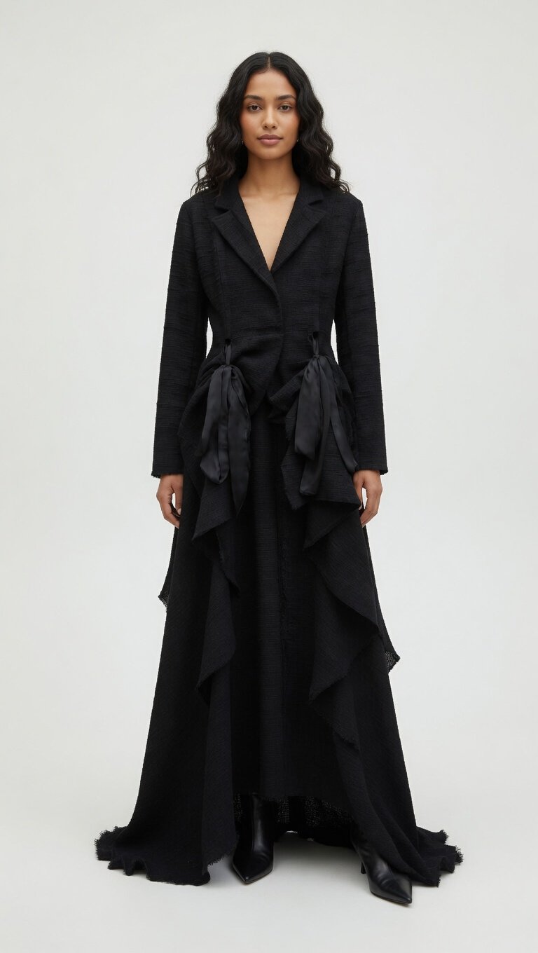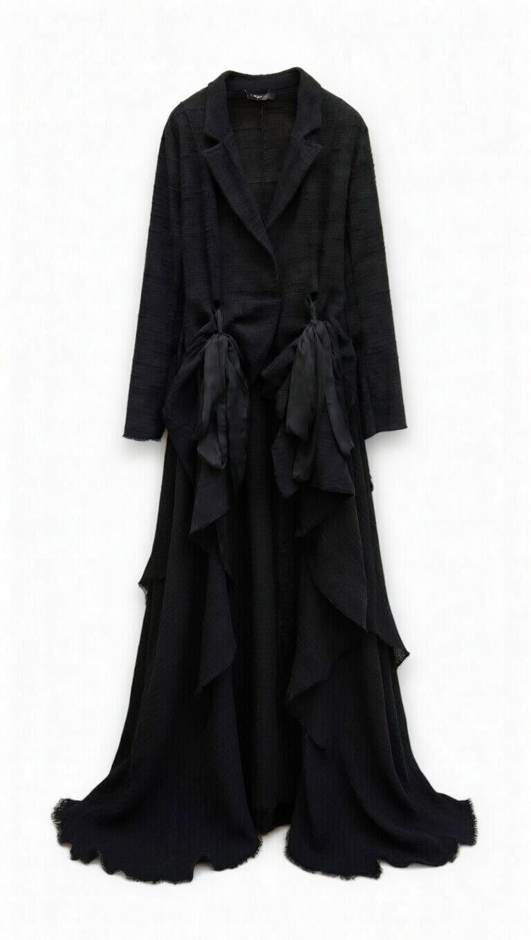 Duster oversize in tessuto texturizzato nero (lino-cotone con effetto crinkle). Colletto revers, vita sottolineata da grandi fiocchi di raso nero e fondo ultra-mosso con strati di volant e orlo irregolare sfrangiato. Un capo drammatico, romantico e super femminile, perfetto da indossare aperto sopra un vestito o chiuso come abito lungo. Look da vera artista.